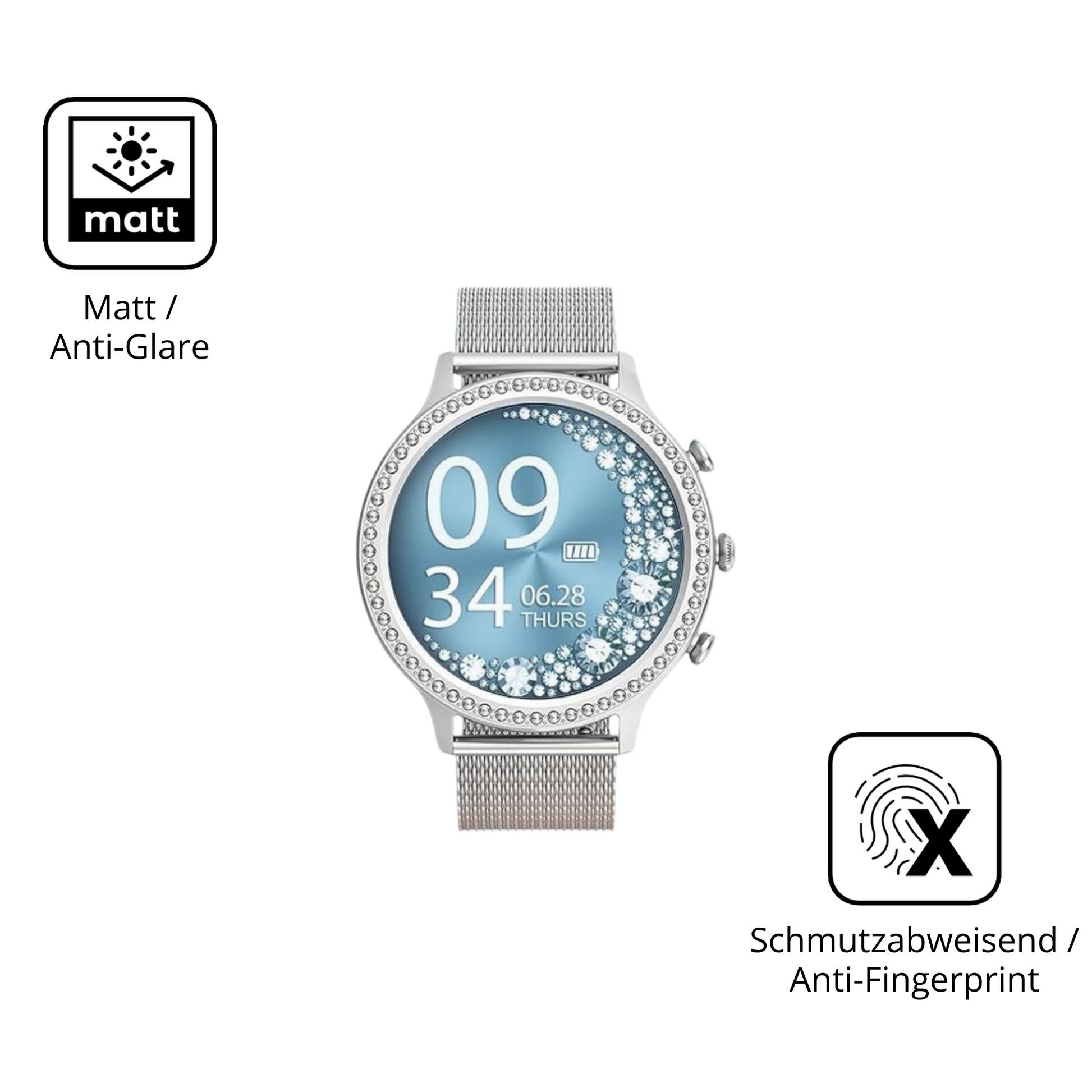 Antireflex (matt) & Schmutzabweisend: Das Display wird mattiert (entspiegelt) und ist bei ungünstigen Lichteinfall besser abzulesen. Dank der oleophobischen Beschichtung haften Verschmutzungen weniger stark an der Oberfläche.