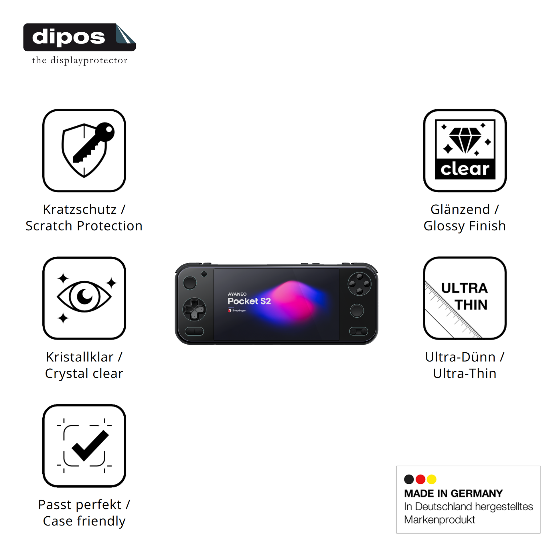 Die dipos Crystalclear Schutzfolie ist mit nur ca. 0,12 mm extrem dünn und unsichtbar, bewahrt das ursprüngliche Design und die Haptik deines AYANEO Pocket S2 6.3 Zoll. -