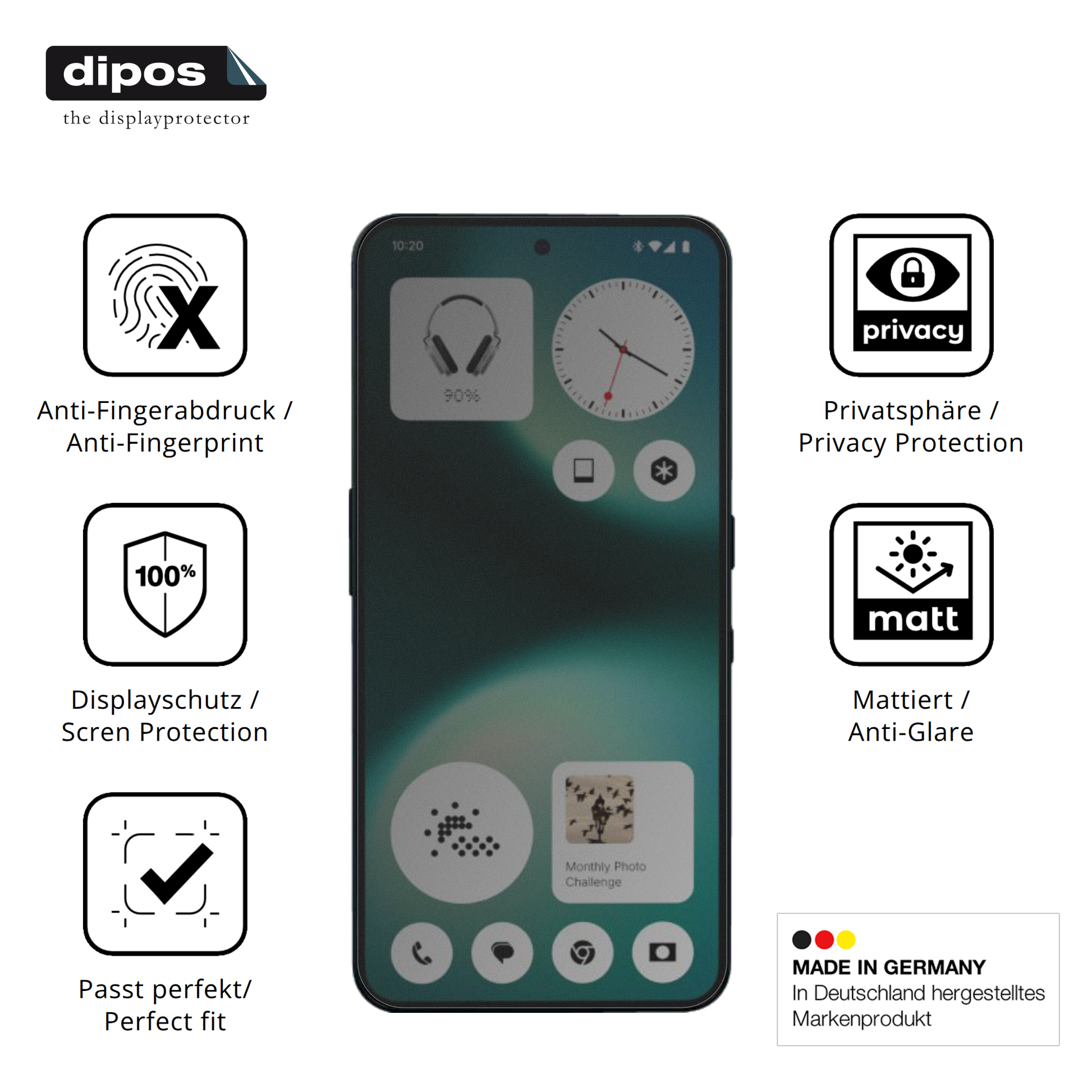 Wichtiger Hinweis: Durch den integrierten Blickschutzfilter wird die Displaydarstellung etwas abgedunkelt, was aber durch ein Erhöhen der Displayhelligkeit ausgeglichen werden kann. Weiterhin empfehlen wir die Nutzung der dipos Blickschutzfolie eher auf Geräten in dunklen Farben, da es bei weißen bzw. hellen Geräten optisch vielen Kunden nicht zusagen wird. Hierbei ist aber selbstverständlich Ihr Geschmack entscheidend.