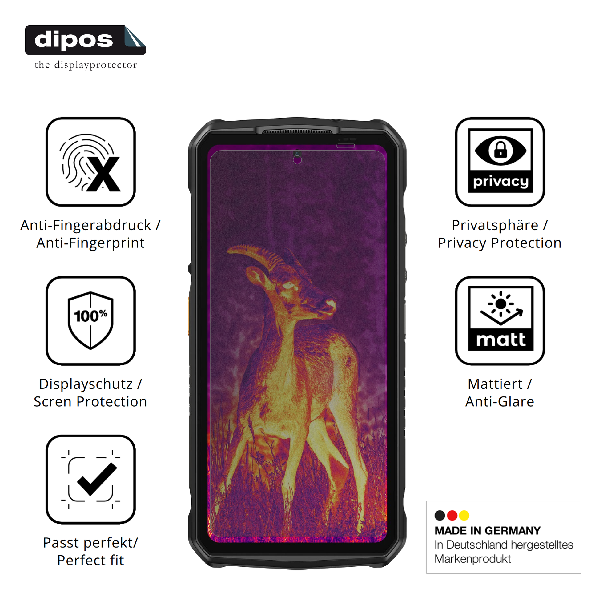 Wichtiger Hinweis: Durch den integrierten Blickschutzfilter wird die Displaydarstellung etwas abgedunkelt, was aber durch ein Erhöhen der Displayhelligkeit ausgeglichen werden kann. Weiterhin empfehlen wir die Nutzung der dipos Blickschutzfolie eher auf Geräten in dunklen Farben, da es bei weißen bzw. hellen Geräten optisch vielen Kunden nicht zusagen wird. Hierbei ist aber selbstverständlich Ihr Geschmack entscheidend.